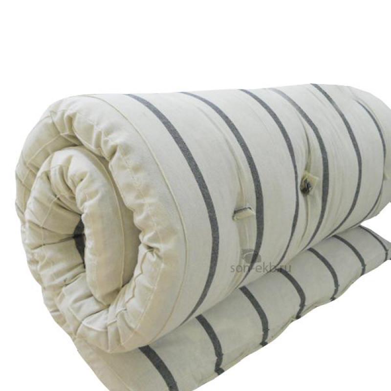 Матрац ширина 70см, длина 190см, без борта. Верх - тик 100% хлопок, наполнение - 4кг РВ (регенерированное волокно). Простеган - 24 закрепки в 3 ряда. РСТ РСФСР 536-81.