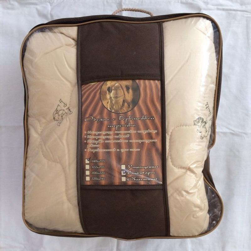 Одеяло ширина 220см, длина 240см, наполнитель - термоскрепленное полотно: верблюжья шерсть 30%, ПЭ 70%, плотность 200 г/м2, верх - микрофибра 100% п/э. Упаковано в сумку-чемодан ПВХ+спандбонд. ГОСТ Р 55857-2013