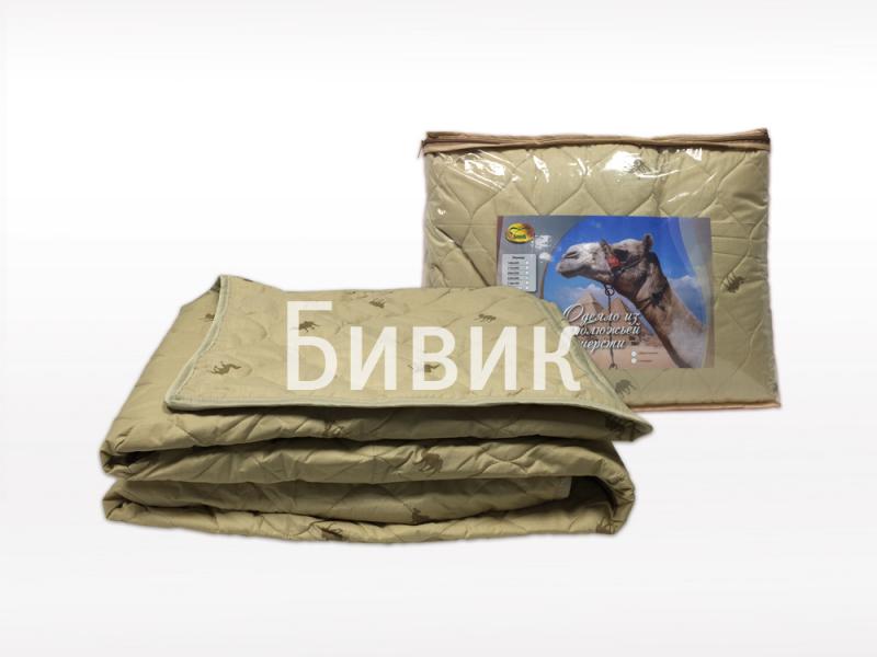 Одеяло ширина 140см, длина 205см, наполнитель - термоскрепленное полотно верблюжья шерсть 30%, ПЭ 70% плотность 150 г/м2, верх - тик 100% хлопок, края одеяла окантованы цветной лентой. Упаковано в сумку-чемодан ПВХ+спандбонд. ОСТ 17-301-84